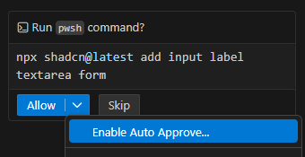 At first, we’ll Enable auto approve to let Copilot execute all commands and avoid asking for confirmation every time.