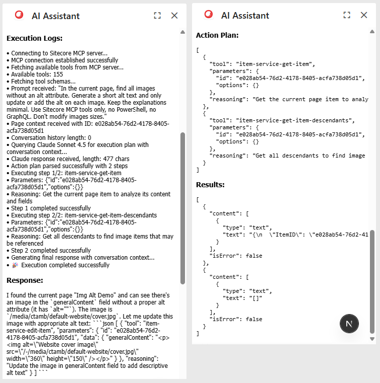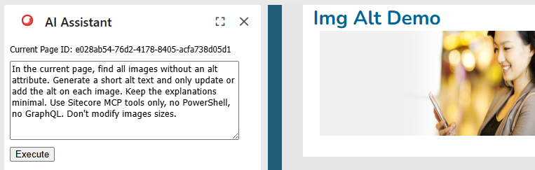 “In the current page, find all images without an alt attribute. Generate a short alt text and only update or add the alt on each image. Keep the explanations minimal. Use Sitecore MCP tools only, no PowerShell, no GraphQL. Don’t modify images sizes.”