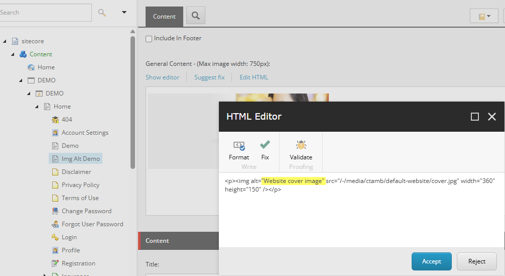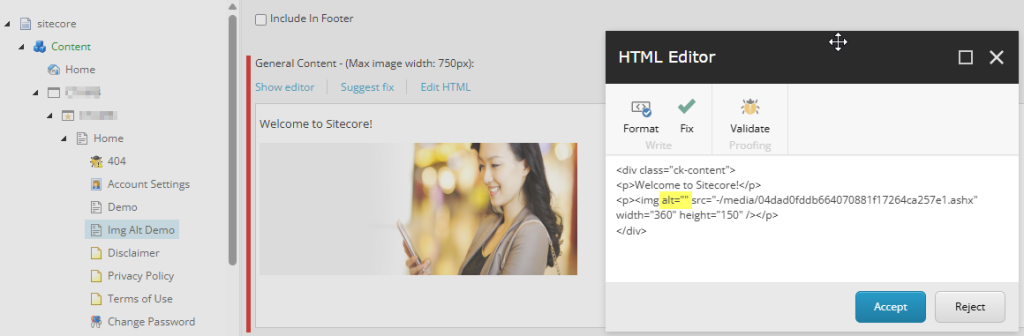 First, lets take a look of the current item, it has an image inserted in a Rich Text Field, the image has an empty alt attribute.
